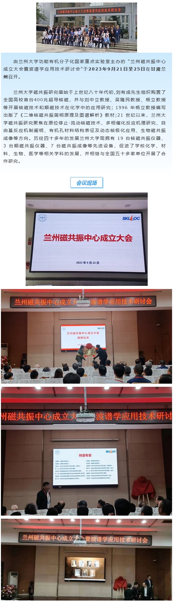 由蘭州大學(xué)功能有機(jī)分子化國家重點(diǎn)實(shí)驗(yàn)室主辦的 “蘭州磁共振中心成立大會暨波譜學(xué)應(yīng)用技術(shù)研討會”于2023年9月21日至25日在甘肅蘭州召開。