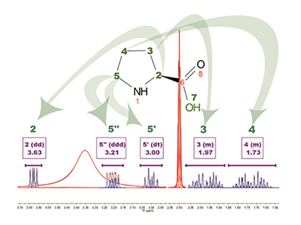 上圖是使用 L-Proline 運(yùn)行 Auto Assignment的結(jié)果,顯示了GSD如何幫助解決重疊問題以及根據(jù)峰型對(duì)譜峰進(jìn)行分類。藍(lán)色峰對(duì)應(yīng)于檢測(cè)到的化合物共振信號(hào),而紅色譜線是識(shí)別為溶劑(DMSO 和水)的信號(hào)。