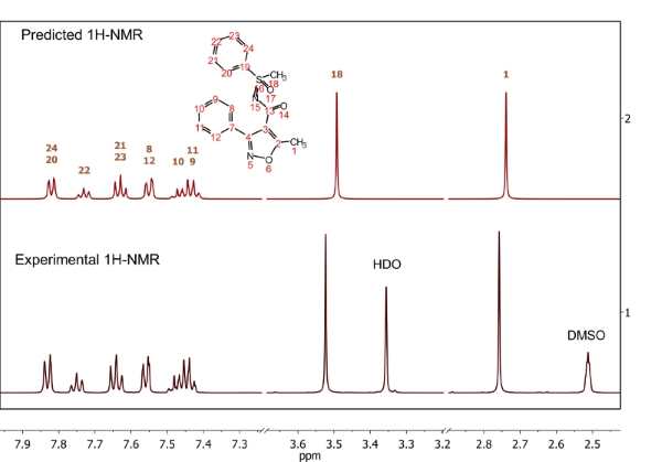 預(yù)測(cè)的1H-NMR 譜圖是使用嚴(yán)格的量子機(jī)制方法合成的,該方法考慮了強(qiáng)耦合效應(yīng)。